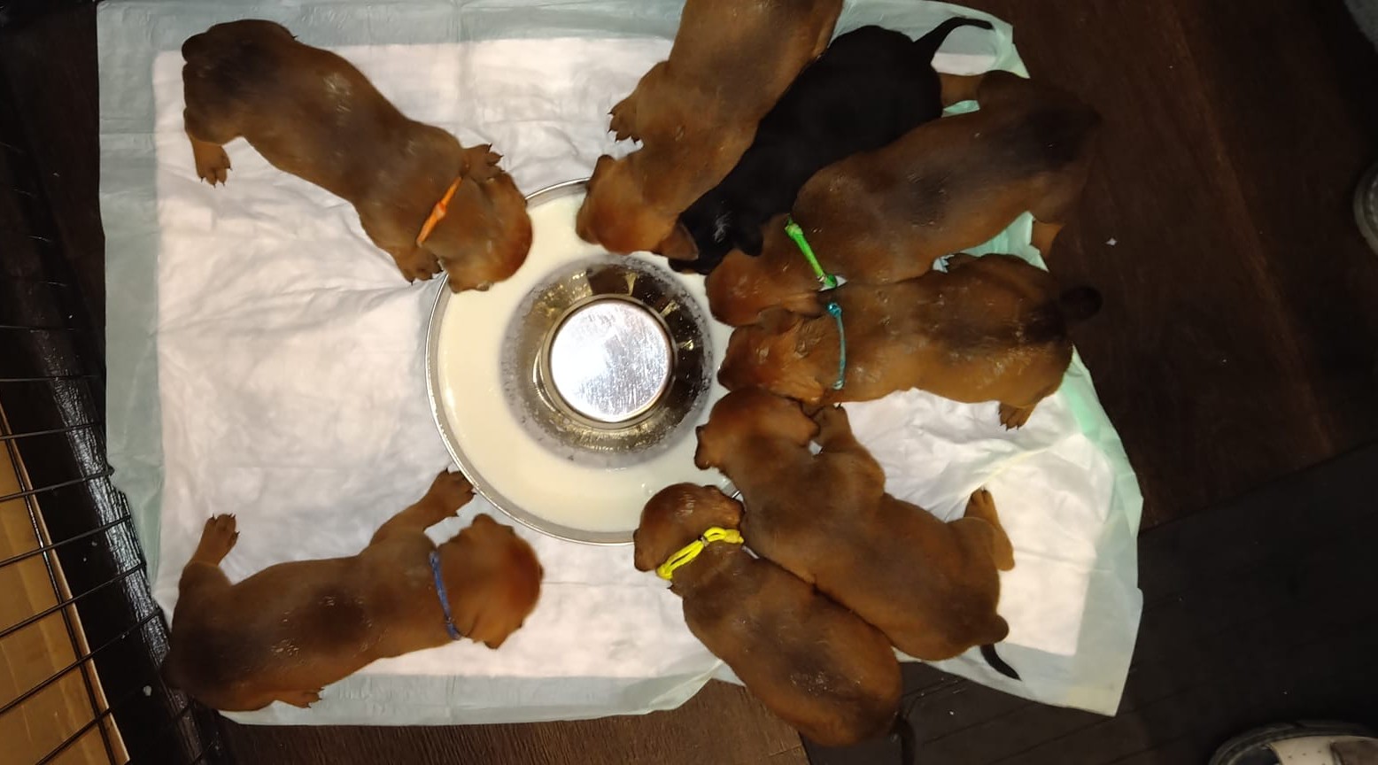 Štěňátka dostala první obojecky. Holčičky jsou růžová, žlutá a tyrkysová.